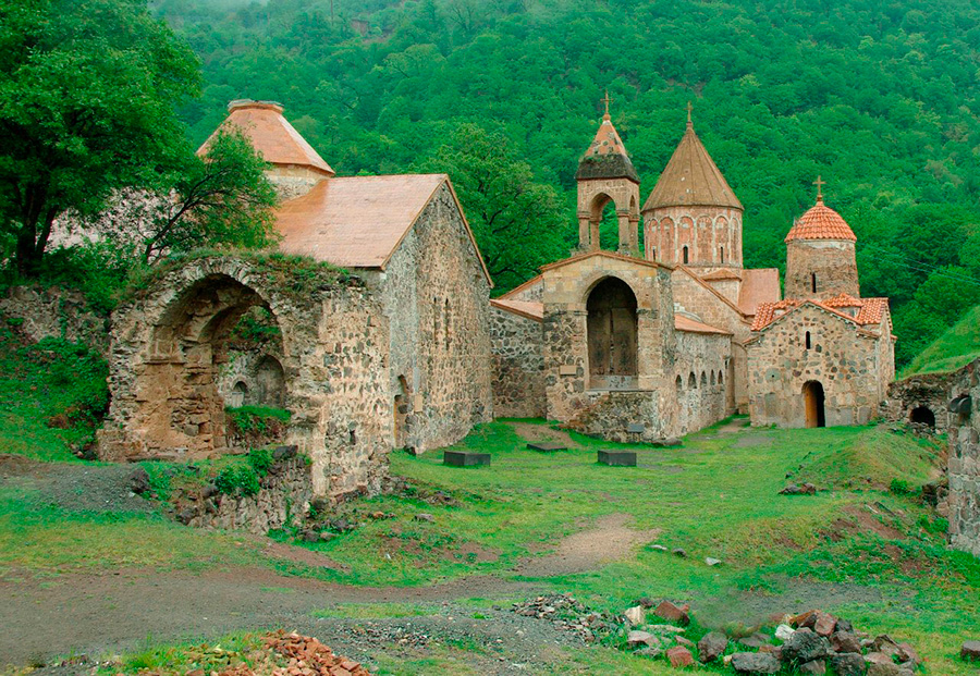 The historic Dadivank Monastery is located in Nagorno-Karabakh, at an altitude of about 1100 meters above sea level, on the southern slope of a forested mountain. The monastery is surrounded by picturesque natural scenery. Small ravines border the slope from the east and west, joining together lower down and forming a natural amphitheater around the complex. In addition to the main monastic ensemble, several small chapels can be found on the surrounding hills. The monastery is carefully positioned so that the view from almost every point — both inside and outside the complex — offers breathtaking panoramas of the surrounding landscape. According to historical chronicles, Dadivank was founded in the 1st century AD on the burial site of Dadi, a disciple of the apostle Thaddeus the Apostle. Because of this connection, the monastery was also known in Armenian sources as Arakelots, meaning “Apostolic.” The medieval Armenian scholar Mkhitar Gosh referred to the monastery as “Arakeladir,” which translates as “founded by the Apostle.” It is believed that in the 4th century, after Armenia officially adopted Christianity as its state religion, the earliest church of the monastery was constructed around the tomb of Dadi. Over the centuries, the complex gradually expanded, becoming one of the most important spiritual and cultural centers of the region.