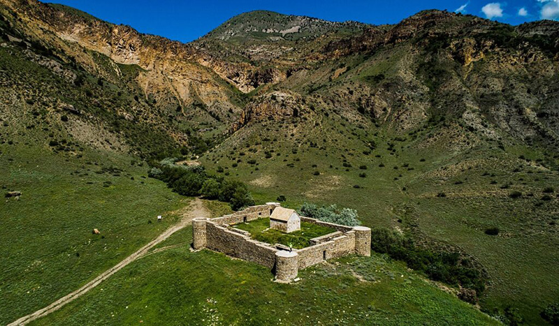 The Gevorg Marzpetuni Fortress is located 6 km northwest of Urtsadzor village in the Ararat region of Armenia. The complex was founded between the 10th and 13th centuries and served as a significant military and cultural center. The fortress features a semi-circular vaulted apse, while the inner rectangular perimeter encloses the ruins of a 12th–13th century church. The main church of the monastery-fortress, built in the 13th century, is a vaulted hall constructed from carefully hewn white felsite stones. Surrounding the church are fortress walls of rectangular plan, with each of the four corners reinforced by round towers. Along the southern and eastern walls, vaulted residential and service buildings were constructed, providing living space and storage for the garrison. Fortresses like Gevorg Marzpetuni were crucial military strongholds in medieval Armenia, combining defensive architecture with ecclesiastical and communal functions.