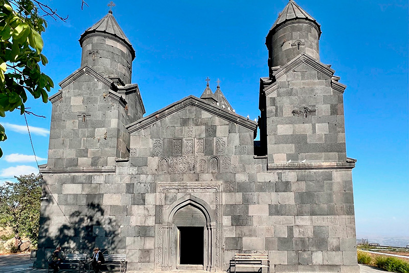 Tegher Monastery is located on the southern reach of Mount Aragats, in the province of Ashtarak. Its church of the Blessed Virgin Mary, a sober cupola’d hall, was built in the 13th century. A gavit, with two chapels erected on its roof, leans against the west flank of the church. [Paragraph Source: Monuments of Armenia] Continuing N. up the mountain from Aghdzk, one bears left at the fork to reach the monastery of Tegher* (176 v), made of dark gray basalt. The gavit, finished in 1232, is particularly impressive. The complex was built at the behest of Mamakhatun, wife of Prince Vache Vachutian, and the architect, according to an inscription on a column of the gavit, was the vardapet Aghbayrik. The ruined village has interesting houses and the remains of a funerary chapel. Taking the right fork, the road winds to Orgov (329 v), with several huge radio-astronomy telescopes, near the telescope one can see a huge mirror plate – an unfinished solar energy station and, in the W part of the village, remains of a Bronze Age cyclopean fort, beside which an underground passage was recently discovered leading to a neighboring spring.